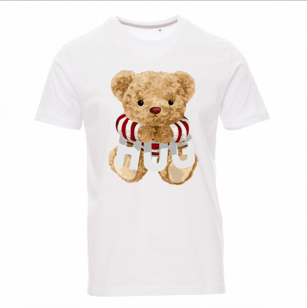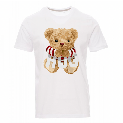 Maglietta 100% cotone 150gr/mq da uomo manica corta con girocollo leggermente ampio, colletto con bordino fine, maniche finite con fine risvolto a taglio vivo, cucita lateralmente.