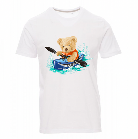 Maglietta 100% cotone 150gr/mq da uomo manica corta con girocollo leggermente ampio, colletto con bordino fine, maniche finite con fine risvolto a taglio vivo, cucita lateralmente.