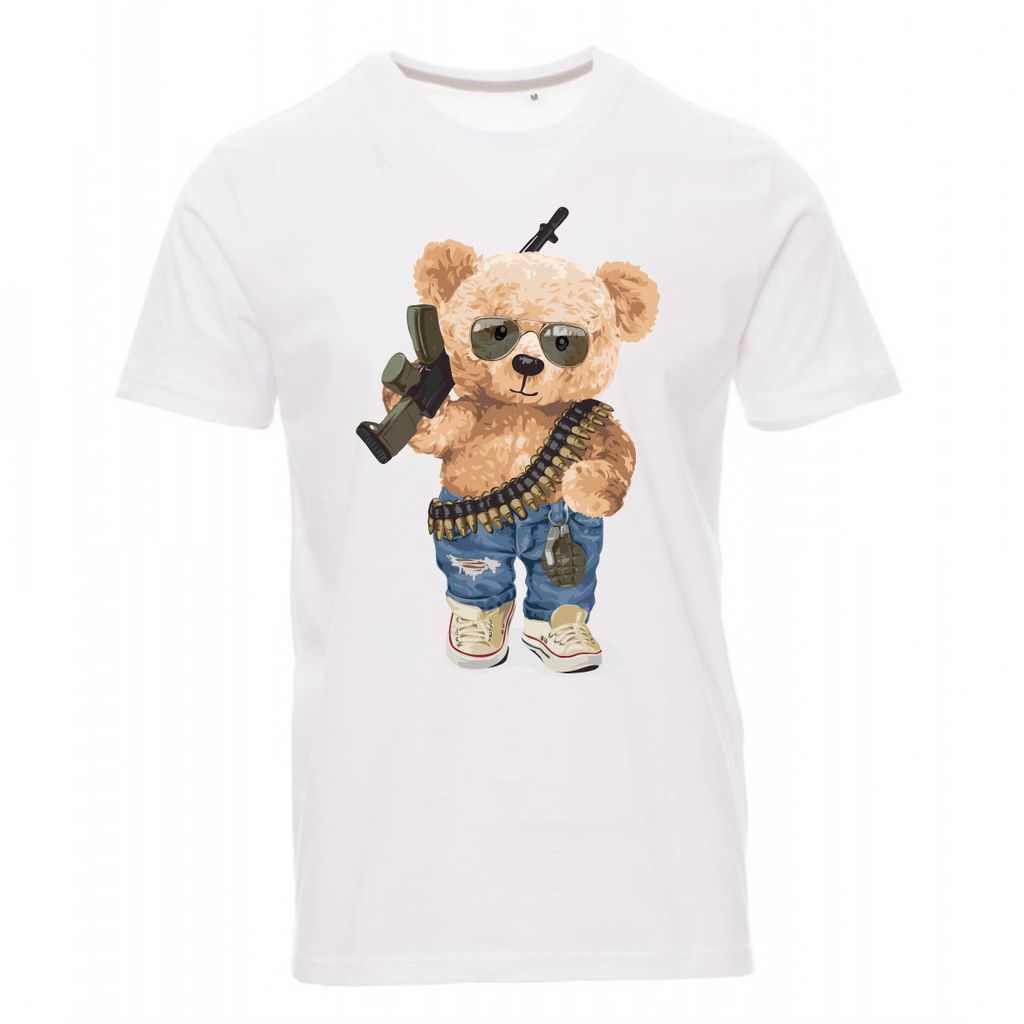 Maglietta 100% cotone 150gr/mq da uomo manica corta con girocollo leggermente ampio, colletto con bordino fine, maniche finite con fine risvolto a taglio vivo, cucita lateralmente.