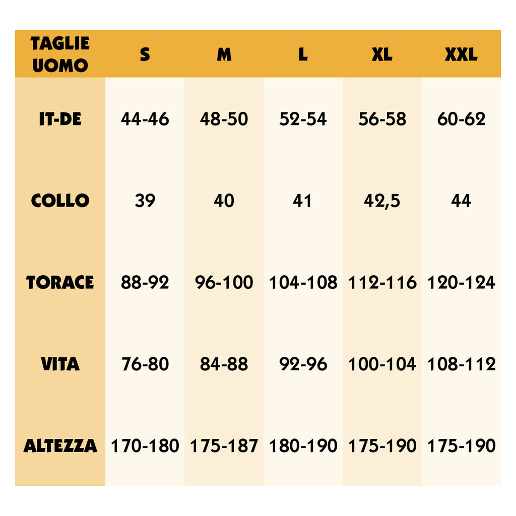 Maglietta 100% cotone 150gr/mq da uomo manica corta con girocollo leggermente ampio, colletto con bordino fine, maniche finite con fine risvolto a taglio vivo, cucita lateralmente.